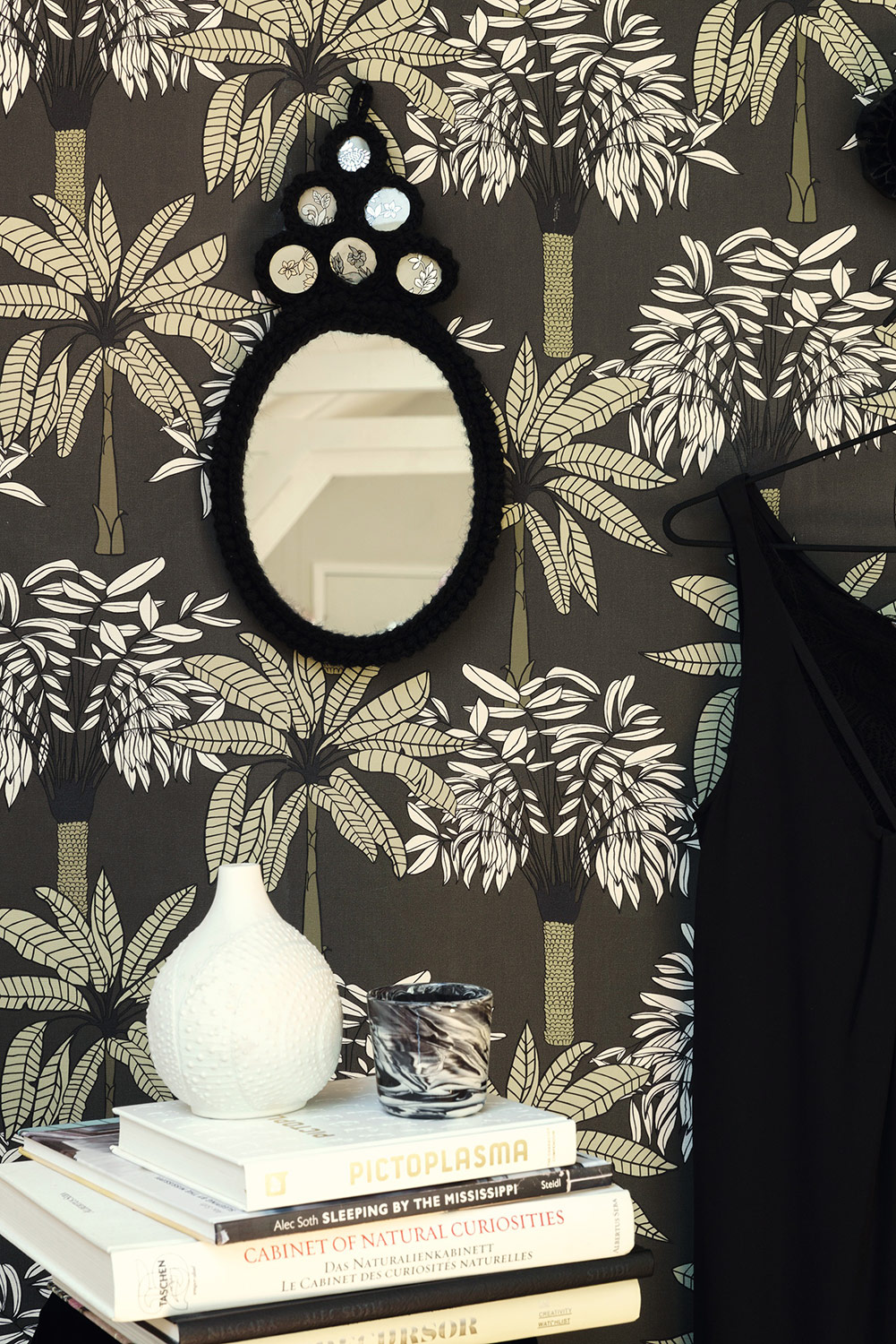 Skandinavisches Wohndesign kann auch wunderbar mit tropischen Palmengewächsen kombiniert werden. Und die zeitlosen Nuancen lassen das hygge-Gefühl garantiert schnell einziehen. Beige und Olivgrün, dazu ein dunkler Naturton im Hintergrund, fertig ist ein neuer Wandlook.