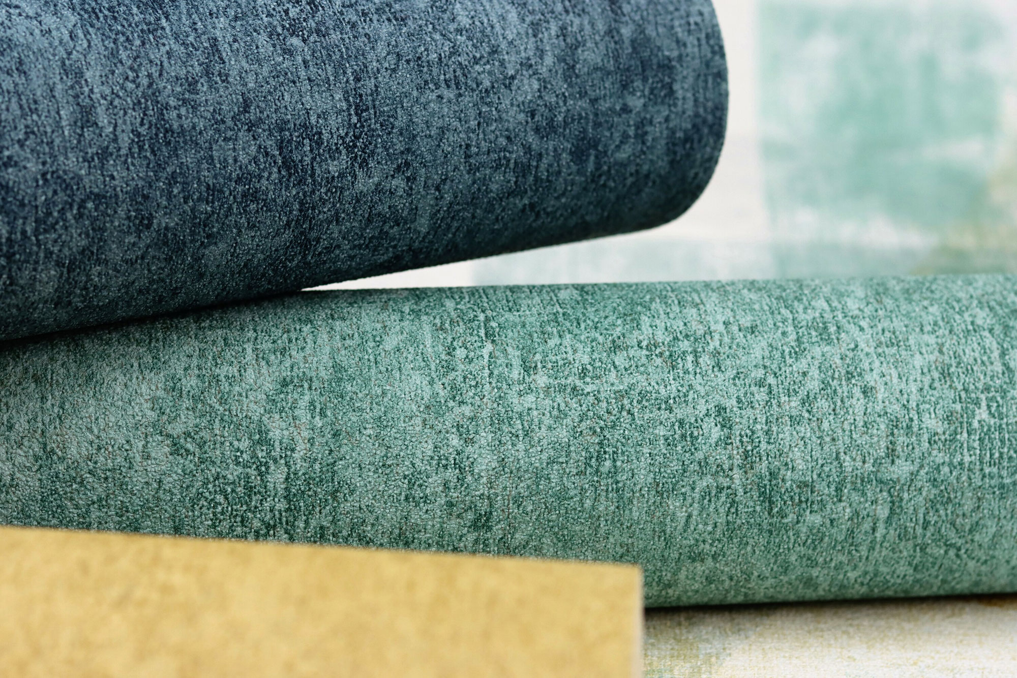 Für die Kreativität des Bewohners spricht aufwändig gearbeiteter Rauputz in einem modernen Denimblau und erweckt so Räume zu neuem Leben. Der Putz kommt ohne viel Aufwand an die Wand in Form einer hochwertigen Vliestapete mit fein ausgearbeiteten Strukturen und Prägungen.